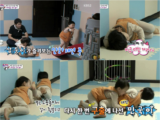 1일 방송된 KBS2 '해피선데이-슈퍼맨이 돌아왔다' 67회 '넌 누굴 닮았니?' 편에서는 민국과 만세가 달밤에 연극놀이를 하는 모습이 그려졌다. 잠들기에 앞서 송일국과 삼둥이는 스스로 기저귀 갈아입는 연습을 했다. 맏형 대한이가 기저귀와 씨름하고 있는 사이 민국과 만세는 '삼둥 극장'의 막을 올렸다. 만세는 평소 자주 보는 애니메이션을 흉내내며 장난감 미끄럼틀을 거꾸로 기어 올라가려 발버둥 쳤다. 이에 민국은 만세를 향해 손을 뻗으며 "안돼! 페이소! 잡아"라고 외쳤다. 민국의 절박한 구조에도 만세는 굴러 떨어졌다. 이때 만세는 벼랑에서 굴러 떨어지는 모습을 묘사하기 위해 "아아아~"비명을 지르며 구르기를 선보였다. 이를 지켜보던 송일국은 "오버액션을 해. 뭐하니 만세?"라며 웃음을 터뜨렸다. 하지만 만세는 부상 연기에 100% 몰입, 폭풍 구르기로 소용돌이에 휩쓸린 연기를 완벽 소화했다. 이에 송일국은 "만세 너 연기 잘한다"며 연기력을 인정했다. 민국 역시 정신을 잃은 페이소 대원을 깨우기 위해 긴급 구조 요청을 하는가 하면 만세를 흔들어 깨우려 해 웃음을 자아냈다.