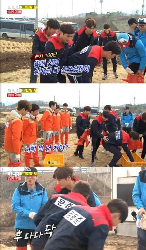 이날 '런닝맨' 멤버들과 신화, 제국의 아이들은 오프닝을 마치고 게임을 위해 늪지대로 이동했다. 이후 신화와 '런닝맨' 멤버들은 미션 장소에 먼저 도착, 옷을 갈아입고 장화로 갈아 신은 뒤 게임 준비를 마쳤다.
