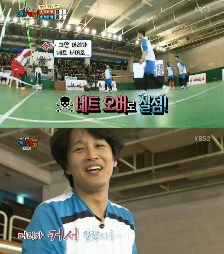 이날 강호동은 헤딩 공격을 시도하려다 라인을 넘어 실점했다.