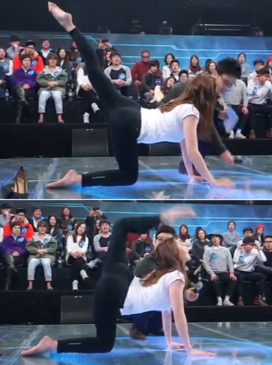 이어 신수지는 일반인은 도저히 따라 하기 힘들 정도의 유연함을 선보였다. 신수지는 다리를 뒤쪽으로 들어올려 발바닥이 자신의 머리에 닿을 만큼 스트레칭을 했고, 관중석에선 탄성이 터져 나왔다.