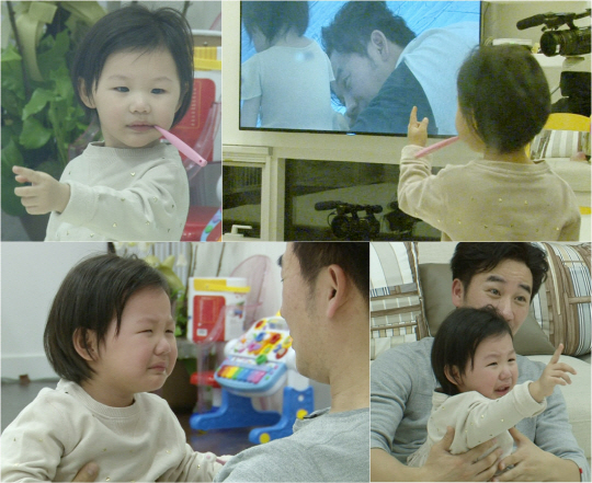 최근 진행된 KBS2 '해피선데이-슈퍼맨이 돌아왔다(이하 슈퍼맨)' 68회 녹화는 '봄이 오는 소리'를 테마로 꾸며졌다. 이날 엄태웅의 딸이자 '미소천사'로 불리는 순둥이 엄지온은 '슈퍼맨' 방송을 보다 갑작스럽게 폭풍 눈물을 흘렸다. 지온은 TV에서 '슈퍼맨'이 나오자 두 눈을 반짝였다. 이어 자신의 옆에 앉아있는 아빠가 TV 화면에도 등장하자 눈을 동그랗게 뜨고 "오! 오!"하고 감탄사를 뱉으며 TV와 아빠를 번갈아 가리키는 등 신기해 했다. 그러나 이내 눈에 그렁그렁 눈물이 맺혔고 당황한 엄태웅은 "지온이 왜 울어?"라며 달래기에 나섰다. 하지만 정작 아빠 얼굴을 본 지온은 "아빠! 아빠!"를 연발하며 점점 더 서럽게 눈물을 쏟아 그 배경에 관심이 쏠리고 있다.