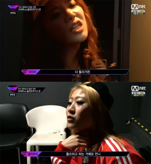 타이미는 "넌 나 없으면 아무리 잘해도 통편집", "넌 나아니면 이 쇼에도 못 나왔다", "발성이랑 발음부터가 급이 다르다. 잘 봐둬", "네 몸뚱이 코끼리"라며 직설적인 랩가사로 모두를 충격에 빠트렸다.
