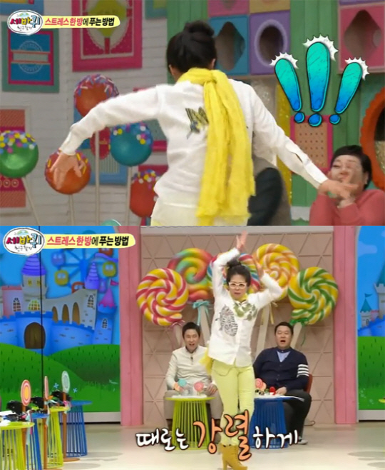 황석정은 음악이 나오자 팔을 허우적거리며 거침없는 막춤을 선보여 스튜디오를 초토화 시켰다.