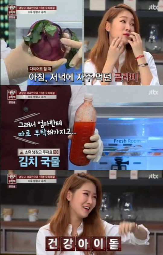 이날 소유가 공개한 냉장고에는 해감 중인 모시조개와 벌집 꿀, 인삼 떡갈비, 양념 조기, 매생이 전 등 다양한 건강 음식이 쏟아져 나와 셰프들의 극찬을 받았다.