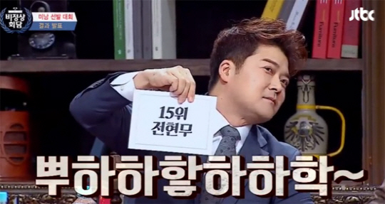 이어 상위권 못지않게 기대를 모은 하위권도 발표됐다. 투표 결과 하위권 5명 중 3명이 전현무, 유세윤, 성시경이었고, 그중에서도 전현무가 15위를 기록해 꼴찌를 차지했다.