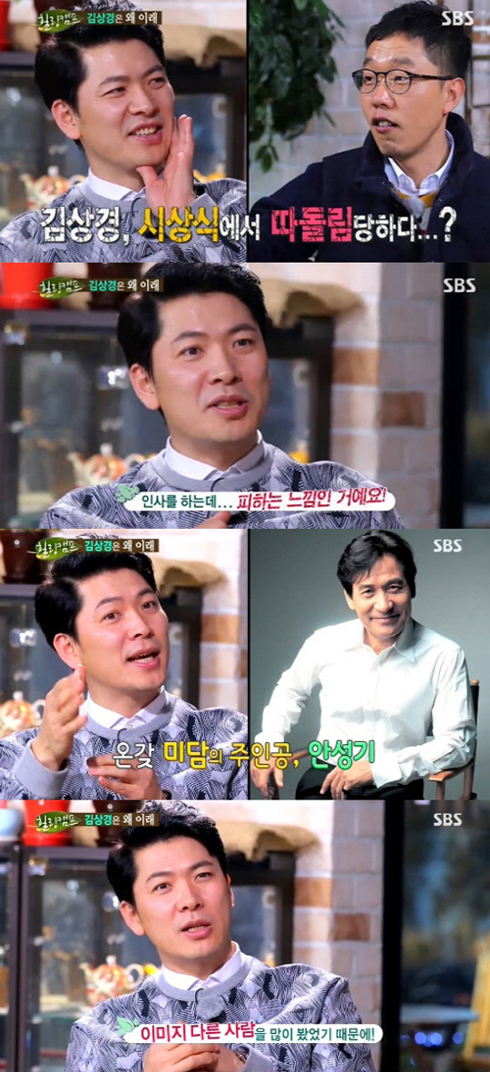 이날 방송에서 MC 김제동은 "김상경이 시상식장에서 만난 배우들에게 인사도 안 하고 다른 배우들의 인사도 안 받았다더라"고 운을 뗐다.