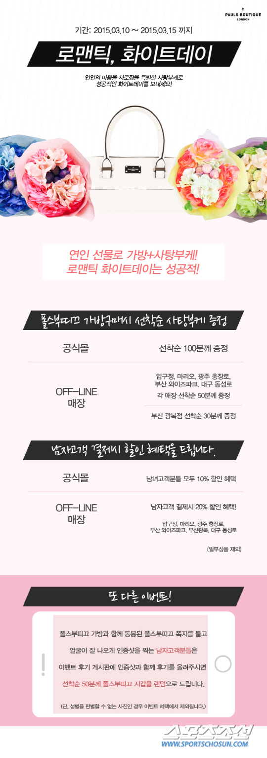 이번 이벤트는 폴스부띠끄 오프라인 매장에 방문 하는 선착순 고객에게 폴스부띠끄에서 특별히 준비한 사랑스럽고 달콤한 사탕 부케를 제공한다. 또한 제품 구매 고객에 한하여 남성이 결재할 경우 20% 할인 혜택까지 주어지니, 선물도 하고 할인도 받는 두 마리 토끼를 잡을 수 있다.