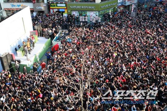 '한국'하면 떠오르는 이미지가 'K팝'으로 바뀌었다. 사진은 지난 1월 아이돌 그룹 엑소가 서울 신촌의 한 화장품 브랜드 이벤트에 참석했을 때 3만 여 명이 몰려든 모습.