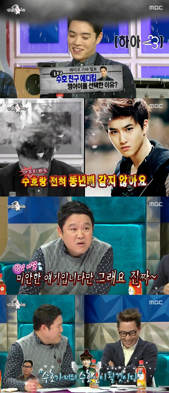 이날 방송에서 에디킴은 "엑소 수호와 절친이다. 동창은 아니고 옆 학교에 다녔는데 어떻게 만나게 됐다"고 밝혔다.