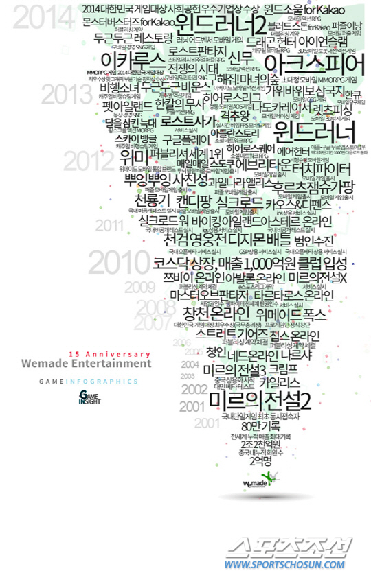 게임인사이트는 위메이드의 창립 15주년을 기념해 그동안 서비스 했던 대표 게임들 약 70여개와 이슈들을 모아 키워드 그래프 형식의 인포그래픽으로 제작했다. 윈드러너, 이카루스 등 바람과 하늘 등의 키워드가 게임에 녹아 있었던 만큼 폭풍과 회오리를 형상화했다.