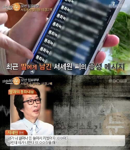이와 관련해 지난해 방송에서 서정희가 폭로한 내용들에 다시 관심이 모아진다. 서정희는 MBC '리얼스토리 눈'에 출연해 서세원이 딸 서동주에게 보낸 음성 메시지를 공개했다.