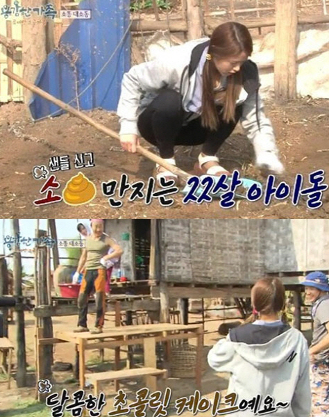 이날 방송에서 가족들과 함께 소 축사 청소에 나선 설현은 굵고 큼직한 소똥이 사방에 널린 것을 보고 장난기가 발동, 연기를 시작했다.
