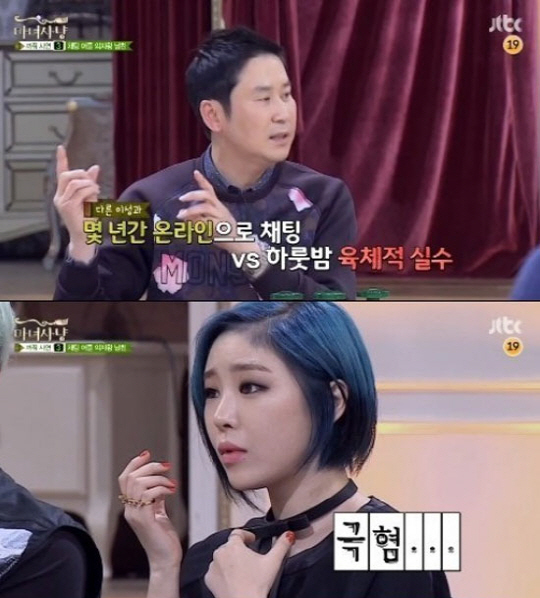 이날 MC 신동엽은 "연인이 다른 이성과 몇 년간 온라인 채팅을 한 경우와 하룻밤 육체적 실수를 한 경우 중 어떤 게 더 낫냐"는 질문을 던졌다.