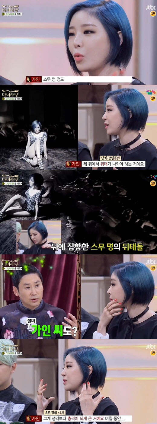 이어 가인은 "생각보다 충격이 되게 크다. 며칠 동안 갔다"며 "간당간당하게 살색 양말로 가렸다. 뒤태가 나와야 해서 티 팬티를 착용할 수가 없었다"고 설명했다.