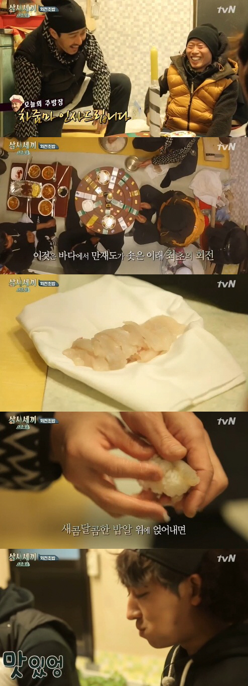 회전초밥과 해산물 피자는 대성공이었다. 차승원이 직접 회를 뜨고 초밥을 만드는 동안, 유해진은 기발한 아이디어로 회전판을 완성해 눈길을 끌었다. 고무대야 뚜껑 가운데에 구멍을 뚫어 기둥을 꽂아 회전판을 완성한 뒤 직접 손으로 돌려가며 먹는 신개념 회전판을 만들어내 폭소케 했다.