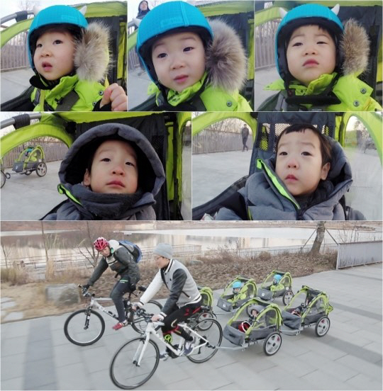 수시로 아빠와 함께 자전거 라이딩을 즐기는 삼둥이에 비해, 자전거 트레일러를 처음 타보는 서언-서준은 바짝 긴장 탓에 몸도 얼굴도 꽁꽁 얼어 붙은 '얼음인형'으로 변신해 웃음을 자아냈다. 그러나 무서움도 잠깐, 쌍둥이는 삼둥이 형들과의 상쾌한 라이딩에 어느새 마음을 열고 바람을 즐겨 흐뭇한 미소를 짓게 만들었다.