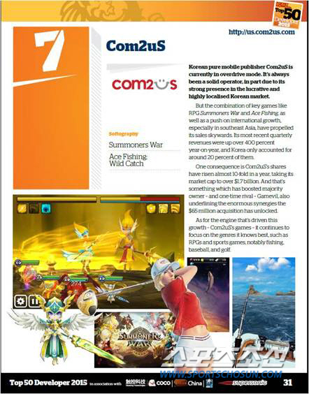 때문에 컴투스는 현재 글로벌 시장에서 좋은 행보를 보이고 있는 슈퍼셀과 킹 등의 개발사와 어깨를 나란히 할 날도 멀지 않았다는 분석까지 나오고 있다. 슈퍼셀은 클래쉬오브클랜, 킹은 캔디크러쉬사가의 글로벌 흥행에 힘입어 세계적인 회사로 성장했으며 컴투스도 비슷한 상황을 이어가고 있다.
