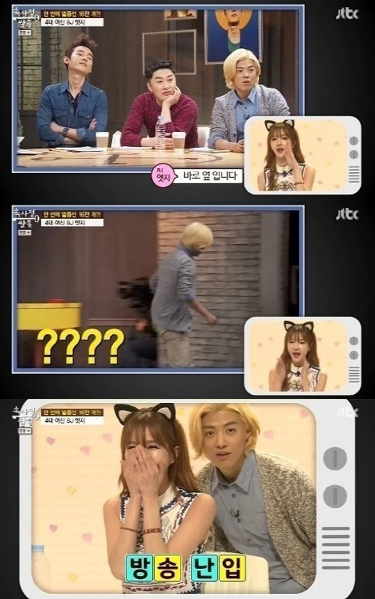 강남의 돌발행동에 출연진들은 "저렇게 가는 건 반칙"이라며 황당한 웃음을 터트렸고, 잠시 후 BJ엣지와 함께 이원 생중계 모니터에 등장한 강남을 본 출연진은 "BJ 옆에 서니까 강남이 갑자기 나이 들어 보이고 얼굴도 커 보인다"고 디스해 웃음을 자아냈다.