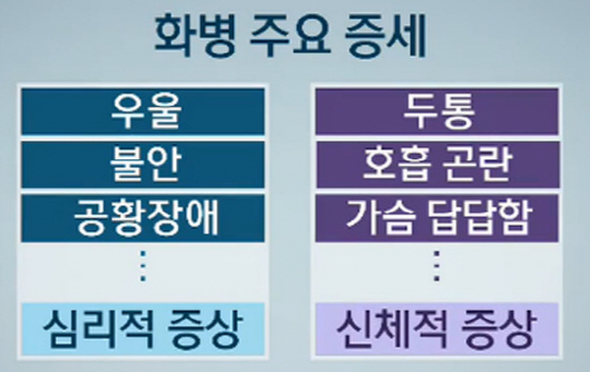 화병에서는 우울감, 불면, 식욕 저하, 피로 등의 우울 증상 외에 특징적인 신체 증상이 동반된다. 특별한 이유 없이 갑작스럽게 금방이라도 죽을 것 같은 공포를 느끼기도 한다. 숨쉬는 것이 답답하고 가슴이 뛰는 증상이 생기기도 한다.