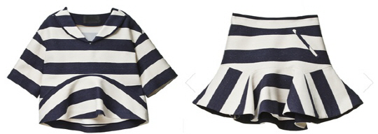 뮤지컬 '아가사' VIP 시사회 참석을 위해 박하선이 홍대에 나타났습니다. 오늘만큼은 그간 드라마에서 보여줬던 단아한 모습을 벗고 네이비 스트라이프가 매력적인 투피스로 발랄한 매력을 뽐냈습니다. 무릎 위로 올라오는 숏한 길이감의 페블럼 스커트의 밑단은 질감이 살아있는 풍성한 플레어 모양이므로 걸을때마다 발랄한 느낌이 가득 풍기네요. 언뜻 세일러 룩의 활기찬 느낌을 가진 이 제품은 럭키슈에뜨의 S/S 2015 컬렉션입니다. 상의는 Stripe Sailor Collar Peplum Blouse(LFBM53001NV)으로 26만 8,000원, 하의는 Stripe Peplum Skirt(LFSM53001NV)로 가격은 24만 8,000원입니다. <스포츠조선 연예패션팀>