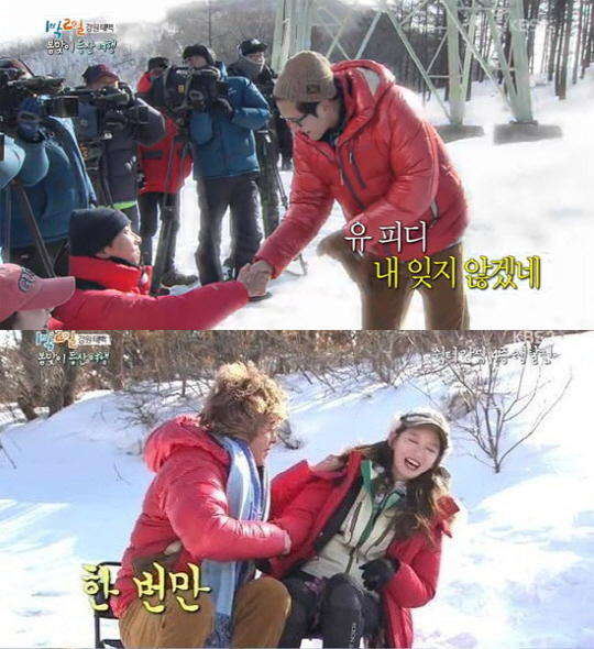 또한 멤버들과 강민경은 산행 중 드라마 '겨울연가'의 명장면을 따라하기도 했다. '욘사마' 가발을 쓰고 강민경과 함께 눈 위에 앉은 김주혁은 그윽한 눈빛을 발사했다.