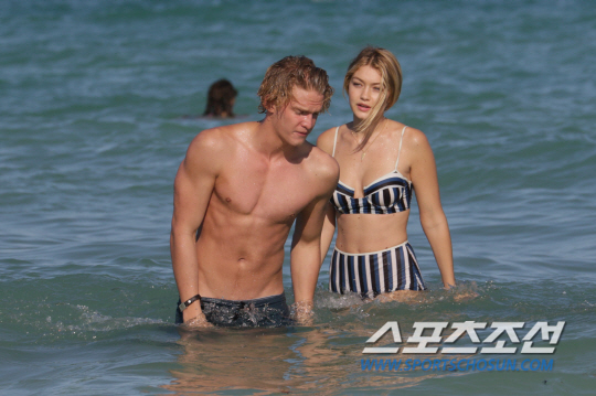 물놀이를 즐기는 미국 톱모델 지지 하디드(20) 커플이 포착됐다.
