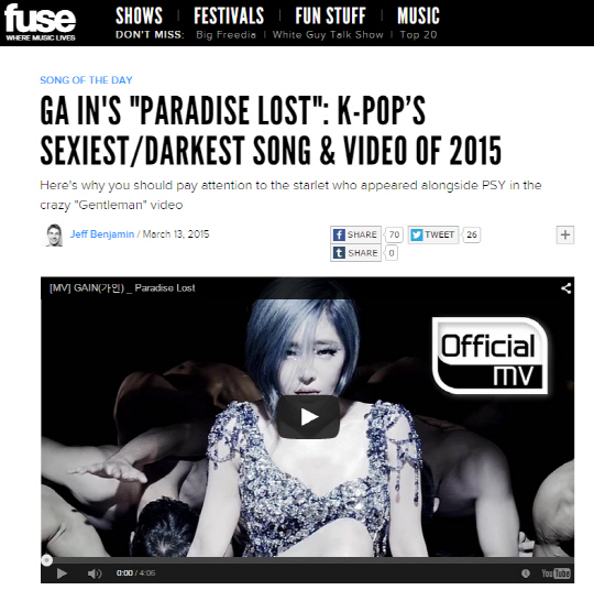 미국의 음악 전문매체 퓨즈TV, 빌보드 등이 가인의 신곡 '파라다이스 로스트(Paradise Lost)'를 집중 조명했다.