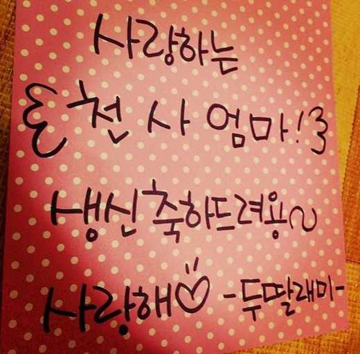 이와 함께 '사랑하는 천사 엄마. 생신 축하드려요. 사랑해. 두 딸래미'라는 글을 직접 찍은 사진을 게재했다.