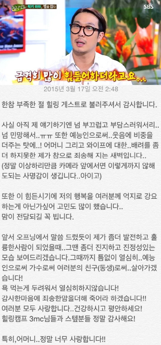하하는 "사실 아직 내 얘길 하기엔 부끄럽고 부담스럽고 민망하다. 예능인으로서 웃음에 비중을 더 주는 탓에 어머니와 아내에 대한 배려를 못해 죄송해 참으로 죄송해 지는 새벽이다"고 말했다.