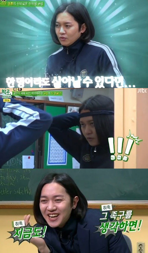 그러나 이후 이어진 체육시간, 강균성은 전혀 다른 모습을 보여주어 반 학생들에게 충격을 주었다. 우선 강균성은 긴 머리를 정리하기 위해 스스로 챙겨온 머리끈을 맸으나 그 모습은 흡사 '망나니' 같아 주위 학생들의 놀라운 시선을 받았다. 결국 그는 머리끈은 하지 않은 채 체육 수업에 나섰다. 이후 강균성은 학생들과의 족구 시간에 몸이 마음대로 되지 않아 실수를 연발하는 학생들의 족구 실력에 혼자 배꼽이 빠졌다.