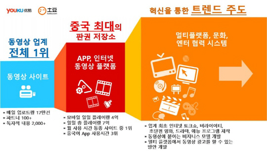 중국의 유튜브로 통하는 '유쿠'는 일간 순 방문자 1억2000만명, 월 사용자 4억500만명에 이르는 중국 최대 동영상 포털 사이트로 독자적인 동영상 기술 플랫폼 구축을 비롯해 영화사 및 방송사와 합작을 진행하고 자체 프로그램을 제작하는 등 혁신적인 사업모델을 통해 업계를 선도하고 있다.