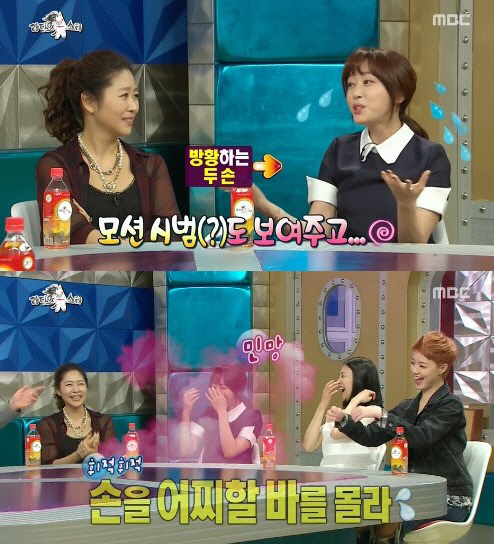 그러면서 강예원은 "남자 성기 모형들을 잡고 설명했어야 했다"며 실제 모형을 잡는 민망한 손동작을 보여 MC들을 당황케 했다. 하지만 강예원이 계속해서 민망한 손동작을 보이자 MC들은 "강예원 씨 손 묶어 달라"며 모션 금지령을 내려 웃음을 안겼다.