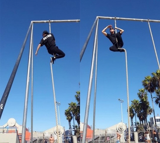 김수현은 높은 밧줄에 매달린 채 개구진 포즈를 취하고 있는 모습이다. 특히 'ACTOR'라는 글씨가 새겨진 티를 입은 그는 장난기 가득한 모습을 하고 있어 웃음을 자아낸다.