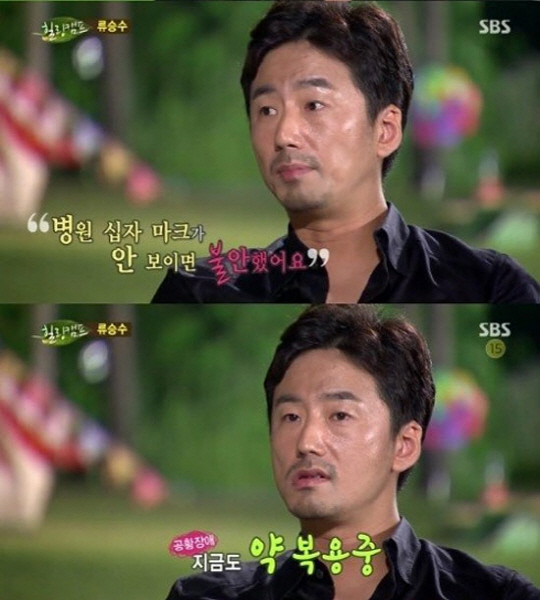 이어 류승수는 "나는 24년 동안 앓았다. 비행기도 못 탄다"고 털어 놓으며, "'겨울연가'가 일본에서 난리가 났는데 모든 배우들은 일본에 갔지만, 난 못 갔다. 그땐 누구랑 어딜 가도 돈이다. 모두 돈을 엄청 벌었지만 난 배도 못 타고 일본에 한 번도 못 갔다"고 설명했다.