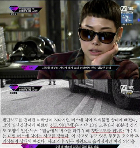 이날 치타는 "17살 때 버스에 치여 실려 갔다. 2차수술을 하는 방법이 있고 인공뇌사를 하는 방법이 있는데 2차수술은 살 확률은 높은데 장애를 가지게 되는 거고, 인공뇌사는 장애를 안 가지고 살아날 확률이 있다고 했다. 부모님이 살아나기 훨씬 더 힘든 건데 인공 뇌사를 선택하셨다"는 힘겨운 과거를 밝히며 'COMA 07'로 카리스마 넘치는 무대를 만들었다.