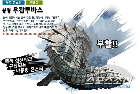먼저 우캄루바스는 몬스터헌터 4G에서 처음 등장하는 몬스터는 아닙니다. '몬스터헌터 포터블 세컨드G(통칭 2G)'에 최초로 등장했습니다. 아캄토룸과 비슷하게 생겼지만 아캄토룸은 2G에서 G급 퀘스트를 수행하기 위한 관문격의 몬스터지만, 우캄루바스는 G급 퀘스트를 올려 ★3의 '최종 긴급 퀘스트'에서야 만날 수 있는 무서운 녀석이죠.