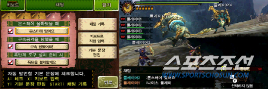 몬스터에 올라타자마자 '몬스터에 올라탔어요!' 수레를 타자마자 '..........죄송합니다.' 눈사람이 되자마자 '도와줘요!!' 등, 말로 하고 싶었던 외침을 채팅창에서 자동으로 보내줍니다. 설정에 헌터가 자주 하는 행동이 등록되어 있어, 등록된 행동에 각각 자신이 원하는 발언문을 지정하거나 뺄 수 있습니다.