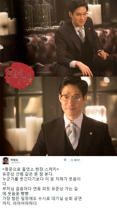 지난 20일 허정도는 자신의 트위터에 "유준상 선배같은 분은 처음 본다. 누군가를 웃긴다기보다 이 분 자체가 웃음이다. 부처님 걸음마다 연꽃 피듯 유준상 가는 길에 웃음꽃 빵빵 . 가장 힘든 일정에도 수시로 대기실 순회 공연까지. 어마어마하다"라는 글을 게시했다.