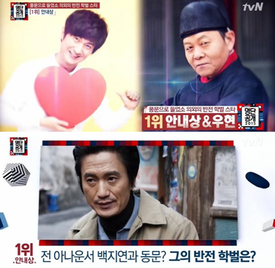 배우 안내상과 우현이 반전학벌 연예인 명단 1위에 등극했다.