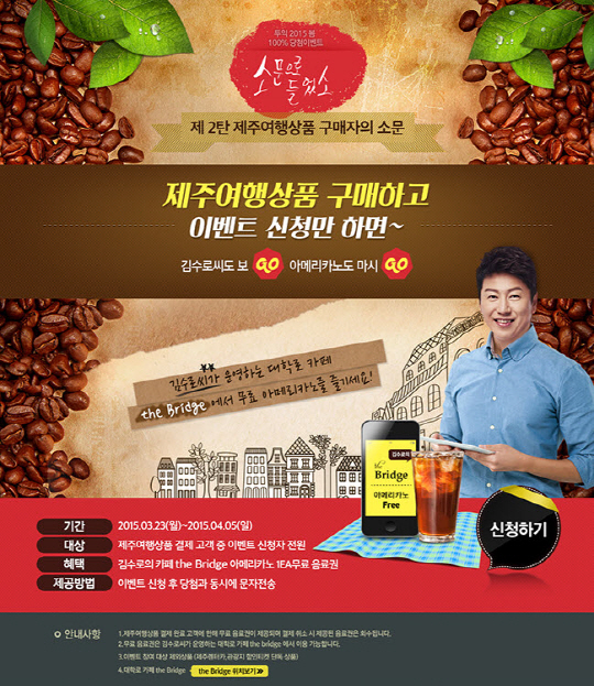 SM C&C 투어익스프레스 관계자는 "투어익스프레스 홍보대사로 활동하고 있는 배우 김수로씨가 더 브릿지 카페 아메리카노 무료음료권을 지원한다"고 밝혔다.
