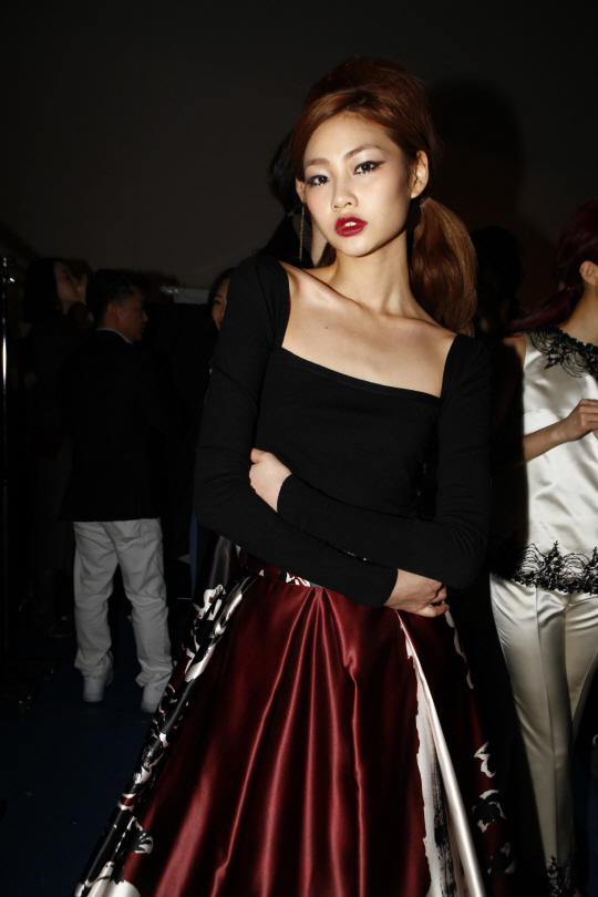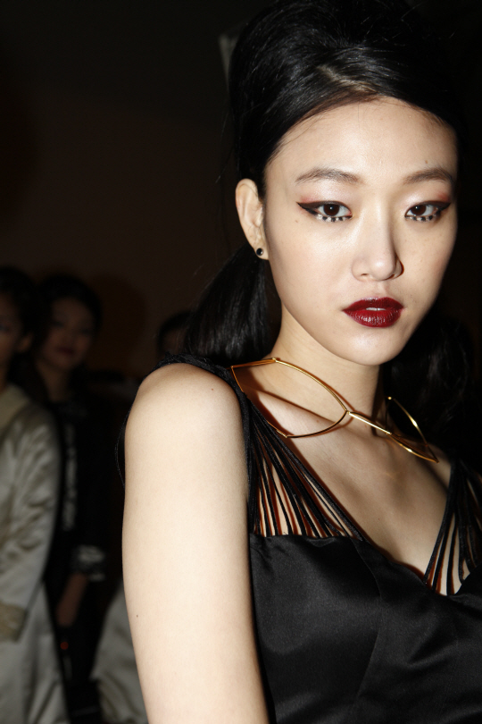 2015 F/W 서울패션위크 지춘희 디자이너의 미스지 컬렉션(MISS GEE COLLECTION)의 백스테이지 현장입니다. '도전수퍼모델코리아 시즌3' 우승자 모델 최소라와 '도전수퍼모델코리아 시즌4'의 3위 정호연이 그 이름에 걸맞게 우아하고 고혹적인 표정으로 카메라를 응시합니다. 짙은 레드의 립컬러는 모든 여자들의 워너비죠? 이처럼 이번 미스지 컬렉션은 블랙 앤 화이트, 버건디. 코발트블루, 핫핑크까지 다양한 컬러감의 드레스로 여자들이 한번쯤 꿈꾸는 과거시대 드레시한 의상을 가득 선보였습니다. <스포츠조선 연예패션팀>