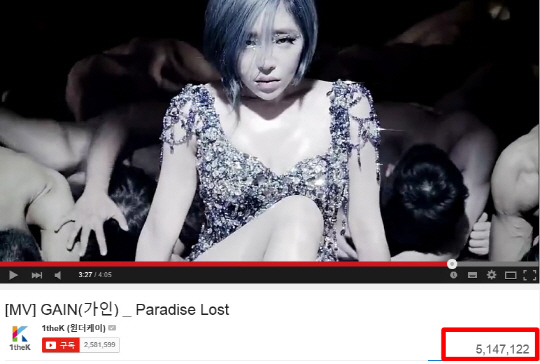 동영상 전문 사이트 유튜브 내 원더케이(1theK) 채널에 올라온 가인의 네 번째 미니앨범 '하와(Hawwah)'의 타이틀곡 '파라다이스 로스트' 뮤직비디오가 지난 12일 공개된 지 10일 만에 총 조회수 500만 회를 돌파했다. 나아가 지난 24일 기준으로 514만 7122회를 기록하며 계속해서 상승곡선을 그려가고 있다.