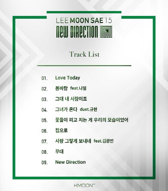 한편 오는 4월 7일 오전 0시 공개되는 이문세의 15집 '뉴 디렉션'에는 나얼과 함께 한 타이틀곡 '봄바람', 규현과의 듀엣곡 '그녀가 온다'를 포함해, '러브 투데이(Love today)', '그대 내 사람이죠', '꽃들이 피고지는 게 우리의 모습이었어', '사랑 그렇게 보내네', '집으로', '무대', '뉴 디렉션' 등 총 9개 곡이 실린다. '뉴 디렉션'은 이문세가 13년 만에 발표하는 새 정규 앨범으로, 전설 이문세가 새롭게 그려나갈 음악적 방향이 담긴 앨범이 될 것으로 알려졌다.