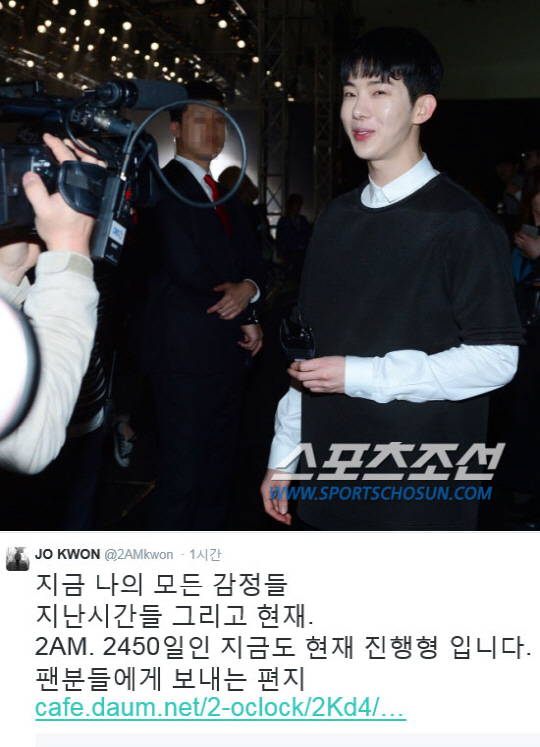 26일 오후 조권은 자신의 SNS에 "지금 나의 모든 감정들 지난 시간들 그리고 현재. #2AM 2450일인 지금도 현재 진행형입니다"라며 팬들을 향한 글을 남겼다.