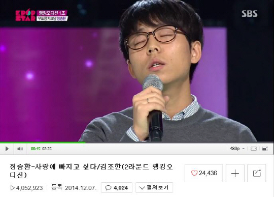 'K팝 스타4' 정승환의 '사랑에 빠지고 싶다' 무대 영상 다시 보기가 오디션 프로그램 최초로 400만 뷰를 돌파하며, 전무후무한 오디션의 새 역사를 창조했다.