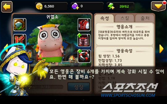 영웅의 성장은 아이템 강화와 진화로 나뉘는데, 캐릭터의 기본 능력을 상승시키는 진화는 게임을 진행하면서 얻는 아이템들로, 강화는 게임 머니를 사용한다. 게임머니는 유저의 캐릭터의 능력에 맞춰 '아르바이트' 공간에서 얻을 수 있어 자연스럽게 전체적인 캐릭터 강화를 유도한다.