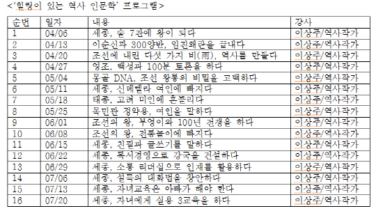 4월 6일 개강하는 이 강좌에서는 역사책에 나오지 않거나 스쳐지나가는 조선의 왕, 특히 세종의 비밀스런 스토리가 공개된다. 기존의 천편일률적인 강의에서 벗어나 스토리텔링 요소가 반영된 창의역사 강의는 이상주 조선왕실(전주이씨대동종약원) 문화위원이 담당한다. 역사작가인 이상주 문화위원은 세계문화유산 종묘대제, 사직대제, 왕릉제향 전승자다. 또 세종 후손으로 조선왕실 전례연구 단체인 영전회 멤버이고, 세종 왕자 밀성군파종회 학술이사다.