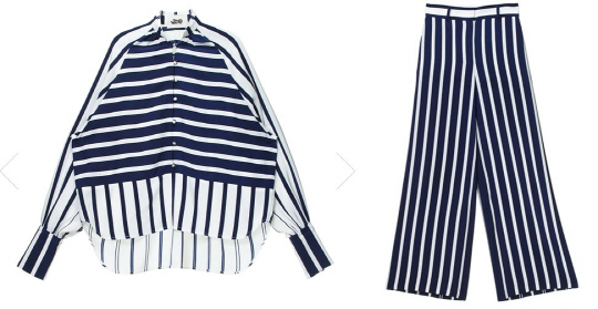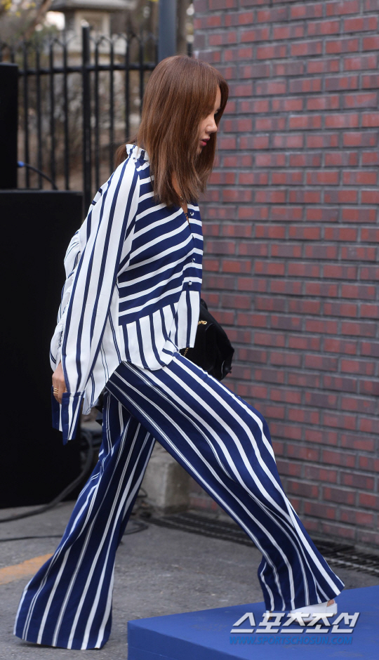 럭키슈에뜨 2015 F/W 컬렉션에 원조 패셔니스타 엄정화가 떴습니다. 루즈한 네이비 컬러 스트라이프 셔츠와 같은 느낌의 와이드 팬츠를 착용했습니다. 특히나 팬츠는 셔츠와 달리 세로 스트라이프 무늬라서 더욱 다리가 길어보이는 느낌을 줍니다. 이들은 럭키슈에뜨 제품으로 상의는 믹스 스트라이프 실크 블라우스, 품번은 LFBM53201NV, 가격은 36만 8,000원. 하의는 믹스 스트라이프 와이드 팬츠로 품번은 LFPM53201NV, 가격은 36만 8,000원입니다. <스포츠조선 연예패션팀>