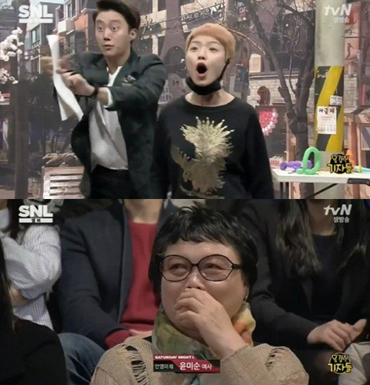 28일 방송된 tvN 'SNL 코리아'(이하 SNL)의 '용감한 기자들' 코너에서는 안영미와 일반인 남자친구의 데이트를 촬영하려는 기자들의 모습이 그려졌다.