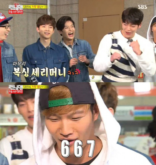 김광수는 "김종국"이라고 연호했고, 능력자 김종국을 슬슬 몸을 풀더니 펀치 기계를 강타했다. 하지만 기대와는 다르게 '667점'이 나와 체면을 구겨 웃음을 자아냈다. <스포츠조선닷컴>
